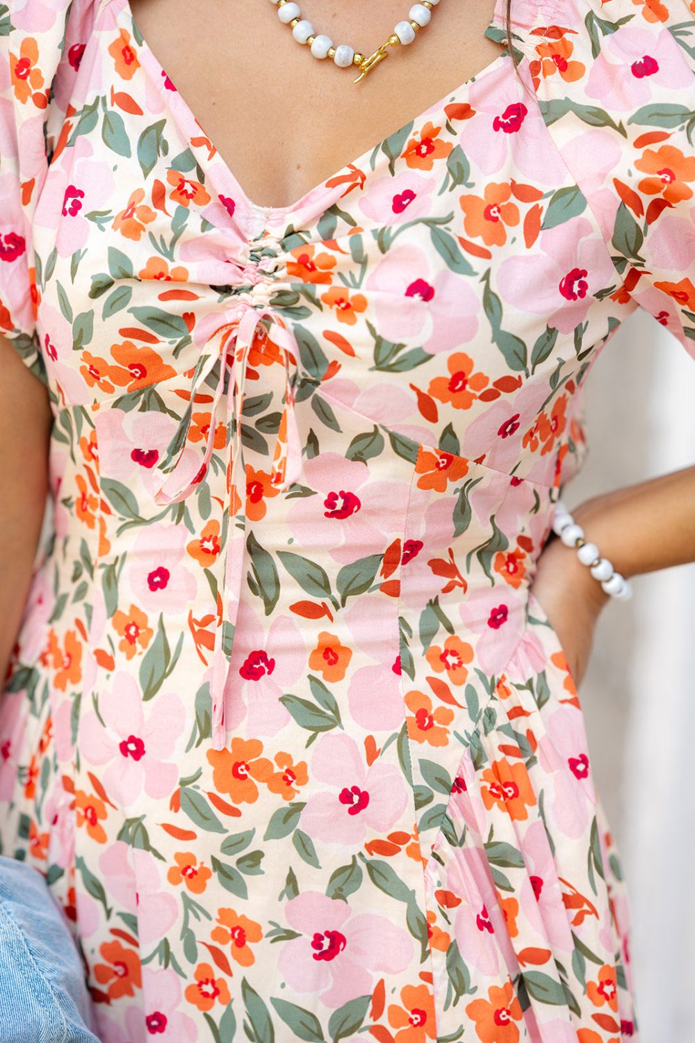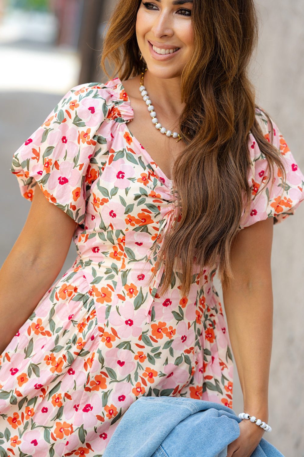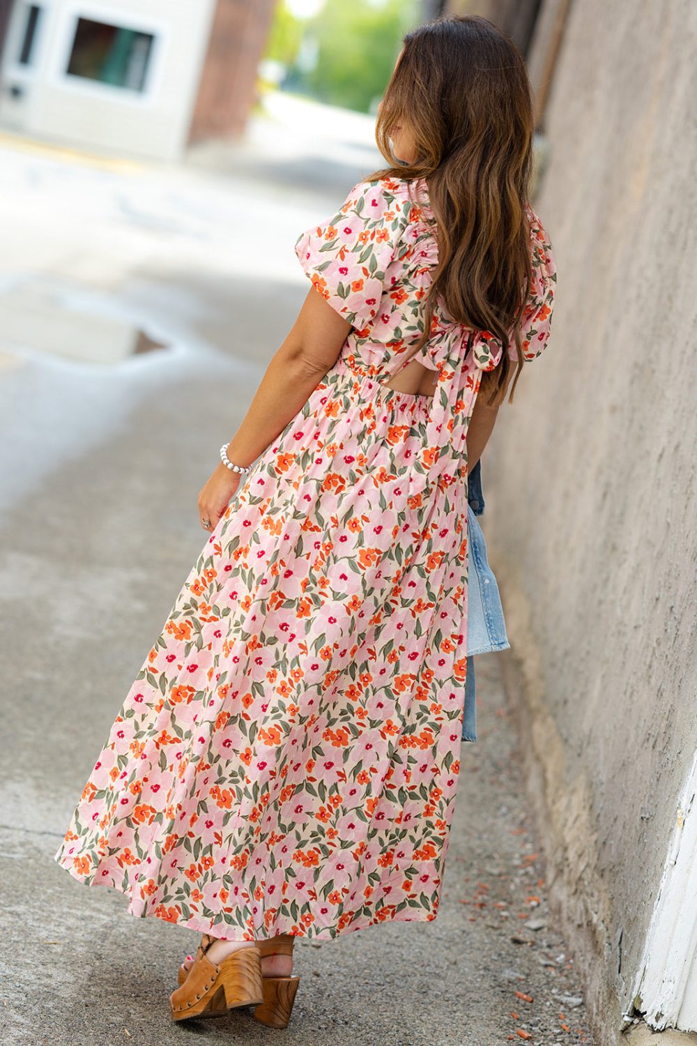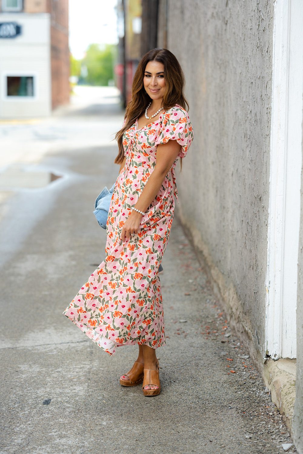 So many things to love about this maxi! The fun floral print, feminine puffed sleeves, the tie accents on both the front and back, and the maxi length are just a few features! We love that this can take you from work to date night with ease and all you need to add if your favorite accessories and footwear!